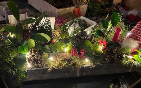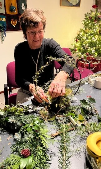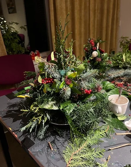 Met een kleine groepje enthousiaste creatieve mensen mooie decoraties gemaakt. Er was weer meer dan voldoende groen gedoneerd door diverse bewoners, van wie wij tuin en heg mochten plunderen. Met een paar gekochte takken met rode bessen, mos en een flinke portie oasis erbij was het voor iedereen weer makkelijk om iets moois te creëren. Bijv. een kerstboompje voor op tafel in de Buurtkamer.
